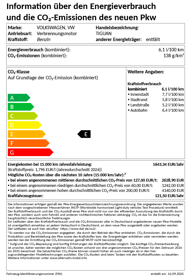 Kraftstoffverbrauch (kombiniert): 6,1 l/100 km, CO₂-Emissionen: 138 g/km